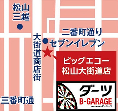 また、スタイリッシュな空間でダーツ投げ放題とお酒が楽しめるダーツバーB-GARAGE松山大街道店も併設し、翌10月17日にグランドオープンいたします。B-GARAGEにはダーツライブ社の最新機種「ダーツライブ3」を5台設置。多彩なルームでのカラオケと、ダーツが気軽に楽しめるエンターテインメント空間を提供します。