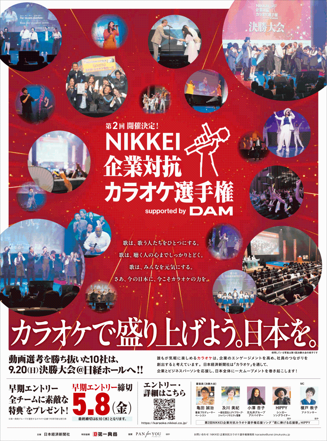昨年初開催で盛況だった「NIKKEI企業対抗カラオケ選手権 supported by DAM」が今年も開催されます。当社は昨年に引き続き協賛し、カラオケを企業エンゲージメント向上につなげる取り組みをサポートします。